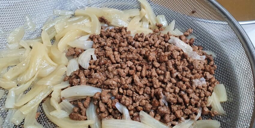 육수 주머니는 따로 버리고, 떡국에 낼 고기와 양파는 체로 걸렀다. 다시 보니 마이야르 일어난 부위가 꽤 많이 보인다.